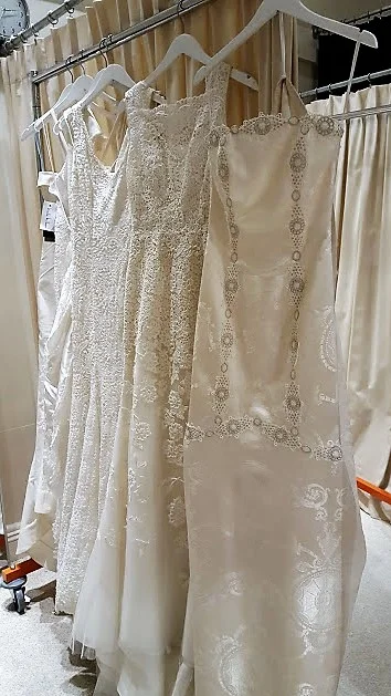 A few of the dresses I tried on. In front is a Claire Pettibone dress on sale for $2450 ($4575 retail). The second dress is by Carolina Herrera for $4100 ($9000+ retail).